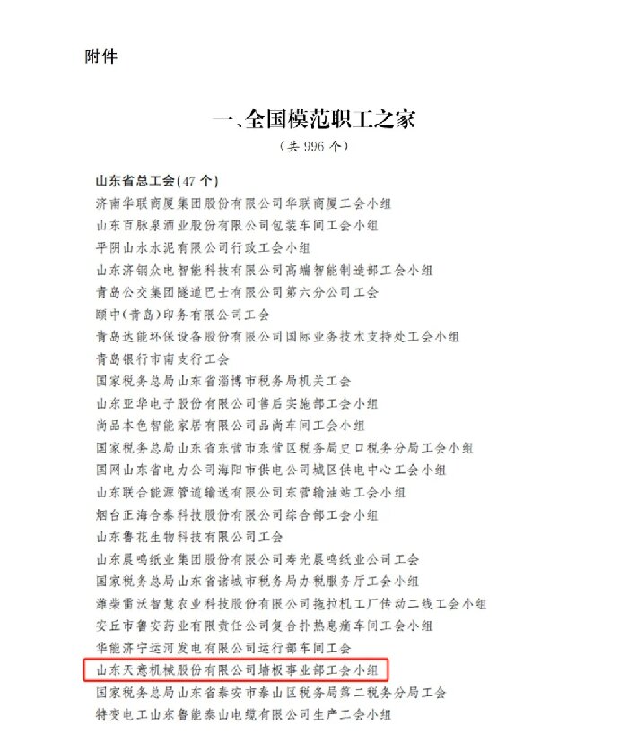 喜報(bào)丨天意機(jī)械墻板事業(yè)部工會(huì)小組獲評(píng)“全國(guó)模范職工小家”