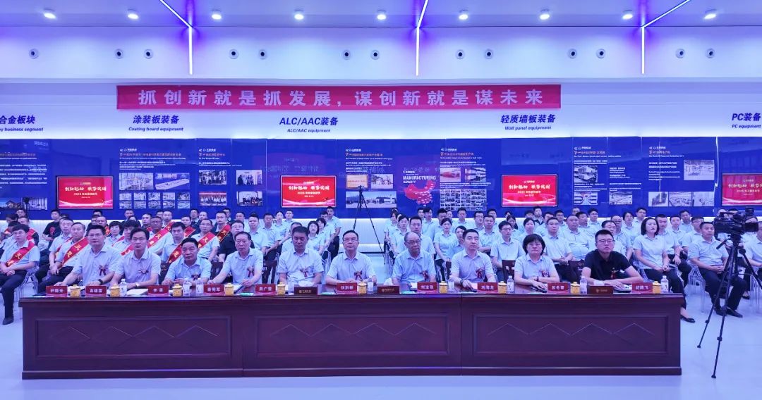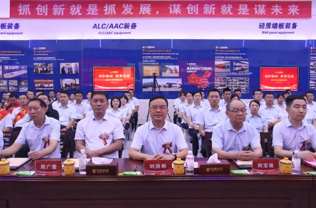 最后,集團(tuán)董事長(zhǎng)劉洪彬做集團(tuán)總結(jié)及未來展望。劉總指出,天意上半年發(fā)展呈現(xiàn)三方面特點(diǎn),第一,創(chuàng)新驅(qū)動(dòng):以創(chuàng)新為市場(chǎng)回暖積蓄力量。上半年,研發(fā)了模塊智能化柔性生產(chǎn)線,為模塊化房屋建造提供智能裝備,研發(fā)了光伏清掃機(jī)器人,提供光伏電站清潔解決方案。天意榮獲山東省五一勞動(dòng)獎(jiǎng)狀,入選山東省先進(jìn)級(jí)智能工廠、省級(jí)專家服務(wù)基地,卓越也建成了新的工業(yè)互聯(lián)網(wǎng)展廳。上半年,產(chǎn)學(xué)研合作邁出新步伐,天意與山東大學(xué)共同舉辦了“天意杯”山東大學(xué)第五屆智造未來創(chuàng)新大賽,山東交通學(xué)院黨委書記王偉一行、山東建筑大學(xué)校黨委常委、副校長(zhǎng)邱立平一行來集團(tuán)參觀座談,共謀發(fā)展新篇章。第二,國際市場(chǎng):用中國智造點(diǎn)亮"一帶一路"。上半年,天意參加了俄羅斯國際工程機(jī)械展、廣交會(huì)、德國寶馬展、漢諾威工業(yè)博覽會(huì)、沙特阿拉伯利雅得五大行業(yè)展覽會(huì)等重量級(jí)國際展會(huì)。塔吉克斯坦總統(tǒng)親臨考察的墻板項(xiàng)目,成為當(dāng)?shù)鼐G色建筑的示范工程。與俄羅斯客戶簽訂了ALC和PC大單。這些突破不僅帶來了42%的出口增長(zhǎng),更讓中國建材高端裝備贏得了世界尊重。第三,強(qiáng)勢(shì)突圍:三大引擎驅(qū)動(dòng)未來發(fā)展。在鞏固裝配式建筑裝備主業(yè)的同時(shí),培育了三大新增長(zhǎng)極,分別是光伏清掃機(jī)器人(已具備智能導(dǎo)航、自主清潔、高效節(jié)能等特點(diǎn))、智慧物流(目前已有京東、拼多多、好想來等大型企業(yè)入駐)、新能源業(yè)務(wù)板塊(天意已實(shí)現(xiàn)了80%的綠電生產(chǎn),正在搭建離網(wǎng)儲(chǔ)能系統(tǒng),未來還將建設(shè)微電網(wǎng)和虛擬電廠)。