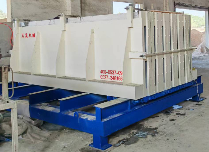 工作原理:模具的開合由下方的液壓機(jī)構(gòu)完成,和墻板機(jī)類似。合模后的鎖緊由上方和兩端的拉桿裝置實(shí)現(xiàn)。下方的強(qiáng)制同步裝置保證了大板在開合時的兩側(cè)同步。大板下方的輪組保證